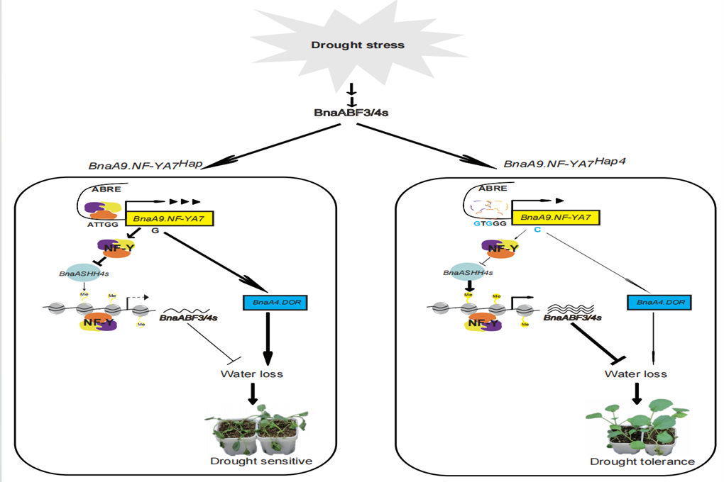 甘蓝型油菜是我国重要的油料作物,其各个生育期均易遭受干旱胁迫的威胁。本研究发现BnaA9.NF-YA7响应干旱胁迫且负调控甘蓝型油菜耐旱性,进一步的研究发现,干旱胁迫下ABA信号通路的关键调节因子BnaABF3/4s直接调控BnaA9.NF-YA7的表达,而上调的BnaA9.NF-YA7可以通过抑制Bna.ASHH4s降低H3K36me3水平来调节ABA信号的级联强度,从而间接抑制BnaABF3/4s的表达。因此,BnaA9-NF-YA7和BnaABF3/4s形成一个反馈调节环,防止ABA信号的过度激活,从而保持甘蓝型油菜生长和胁迫响应之间的动态平衡。BnaA9-NF-YA7启动子上位于CCAAT-box顺式作用元件中的两个SNP导致BnaA9.NF-YA7表达水平显著下调,同时位于转录激活结构域中的M63I(G-to-C)产生的转录激活差异导致BnaA4.DOR表达水平下调,从而降低蒸腾速率和水分损失率,提高叶片保水能力。