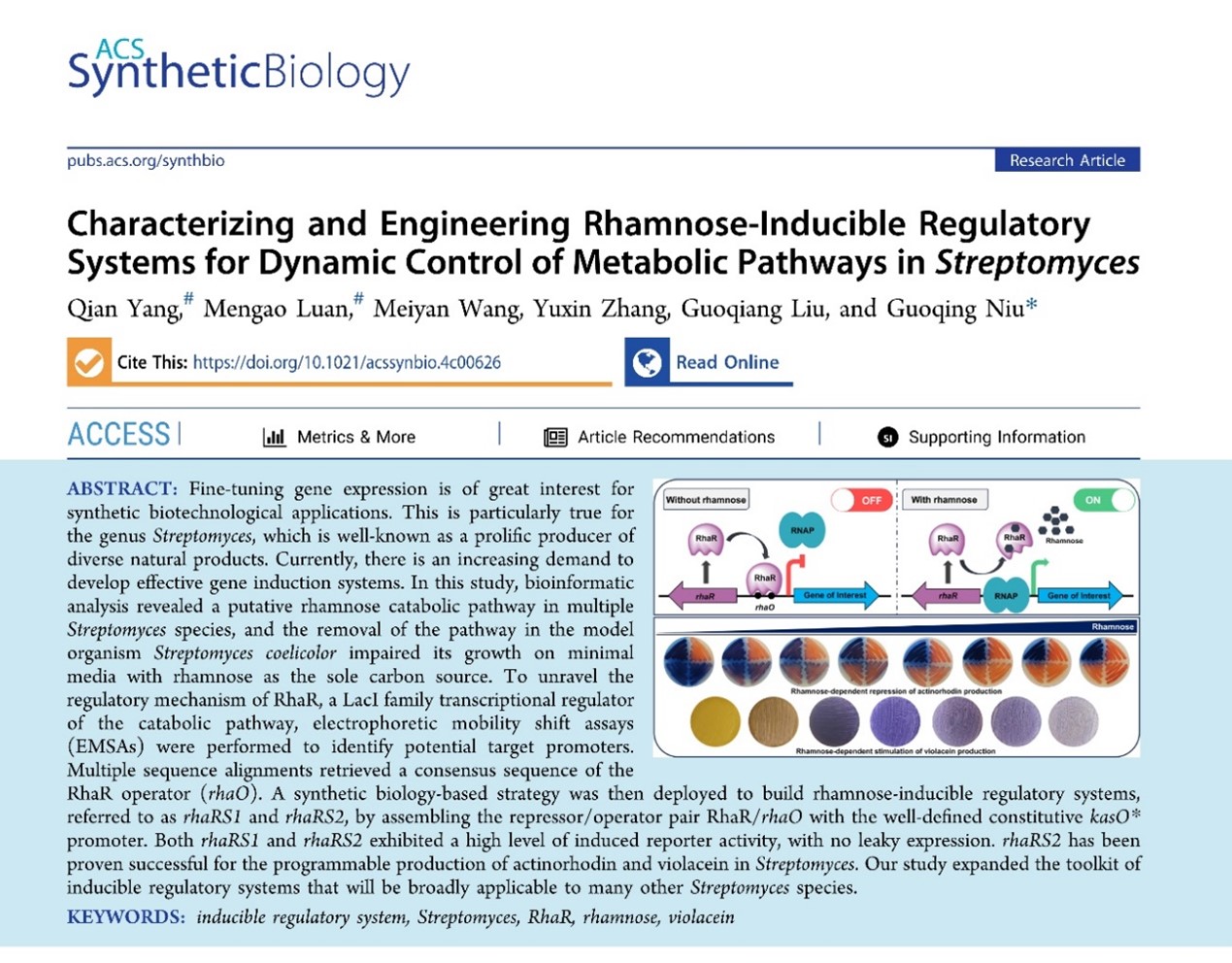 近日,中心牛国清研究员团队利用模块化设计理念组装了一套新型鼠李糖诱导表达系统,成功应用于链霉菌基因表达的精确调控,并实现了放线紫红素和紫色杆菌素的可编程合成,相关成果以“Characterizing and Engineering Rhamnose-Inducible Regulatory Systems for Dynamic Control of Metabolic Pathways in Streptomyces”为题发表于《美国化学学会·合成生物学》(ACS Synthetic Biology)。2022级硕士研究生杨倩和栾孟澳为共同第一作者,博士研究生王美燕和张雨欣以及神农班本科生刘国强参与了部分工作,牛国清研究员为通讯作者。