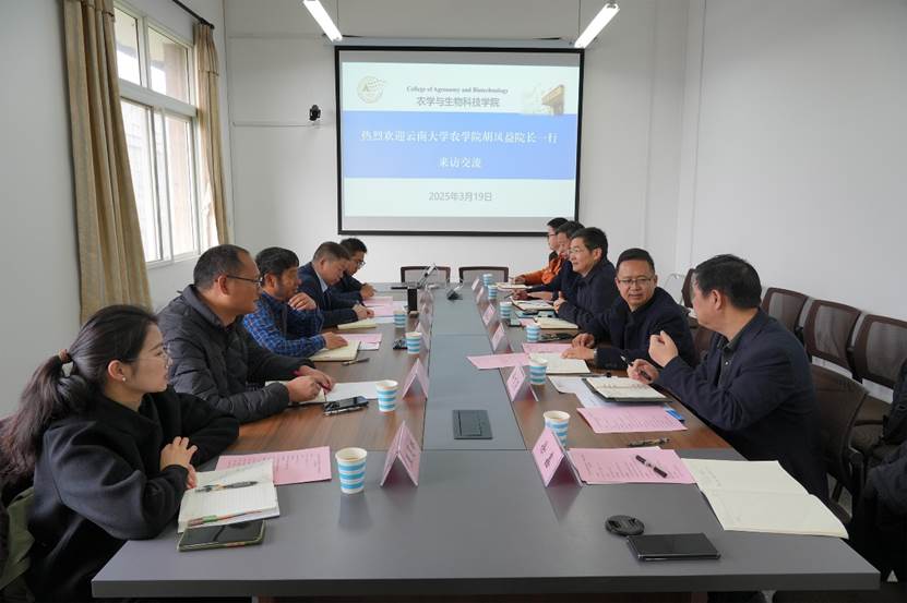3月19日上午,云南大学农学院院长胡凤益、副院长王贤智一行到访学院,就学科发展、专业建设、人才培养等议题开展交流与探讨。学院党委书记阳义健、院长吕典秋、副院长张建奎等领导出席了此次交流会议,会议由吕典秋院长主持。