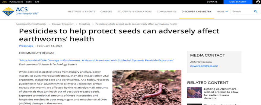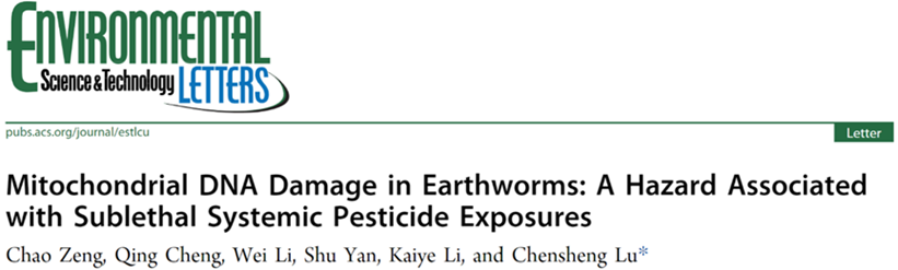 近日,学院吕陈生教授团队以线粒体DNA为目标作用位点,首次揭示了内吸性农药对蚯蚓线粒体DNA的毒性作用。相关研究以Mitochondrial DNA Damage in Earthworms: A Hazard Associated with Sub-lethal Systemic Pesticide Exposures为题,以西南大学为第一完成单位,于2月14日发表在环境领域期刊Environmental Science and Technology Letters。同时,该研究成果得到ACS(American Chemical Society)的特别专题报道。