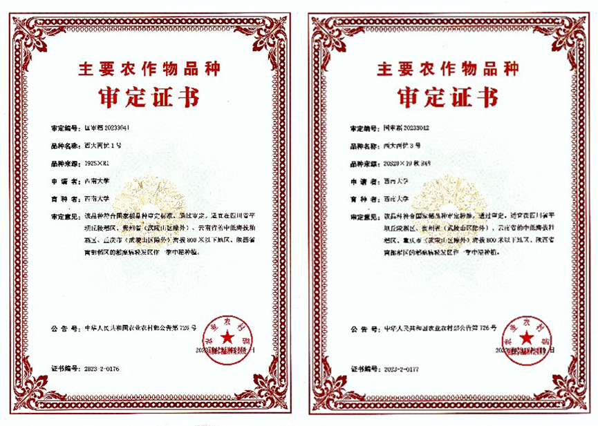 “西大两优1号”(国审稻20233041)、“西大两优3号”(国审稻20233042)于2023年11月双双通过国家农作物品种审定委员会审定。这是我校第一次通过国家审定的两系杂交水稻品种,也是重庆市本地科研院所首次通过创制两系不育系,并用自育的恢复系配组而成的通过国家农作物品种委员会审定的两系杂交稻品种。