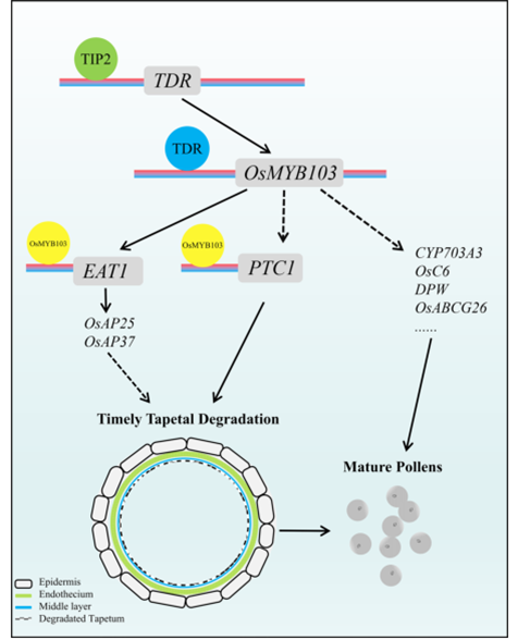 2.精准调控绒毡层程序性细胞死亡对水稻花药和花粉的发育至关重要,在题为“OsMYB103is essential for tapetum degradation in rice”的研究论文中,该团队分离并鉴定了一个水稻隐性雄性核不育突变体osmyb103,该突变体表现出绒毡层降解延迟和成熟花粉缺陷,OsMYB103编码一个R2R3 MYB转录因子。该基因调控两个转录因子ETERNAL TAPETUM 1(EAT1)和PERSISTENT TAPETAL CELL 1(PTC1)的表达,这两个转录因子对绒毡层降解都有正向调控作用。且OsMYB103的表达受TAPETUM DEGENERATION RETARDATION (TDR)的直接调控,并能与之相互作用。该团队提供了遗传证据证实了OsMYB103作用于EAT1的上游,确定了OsMYB103在水稻绒毡层退化的调控网络的位置。结果表明,OsMYB103是水稻绒毡层降解的正调控因子。这些发现丰富了对水稻绒毡层退化的调控网络的理解。