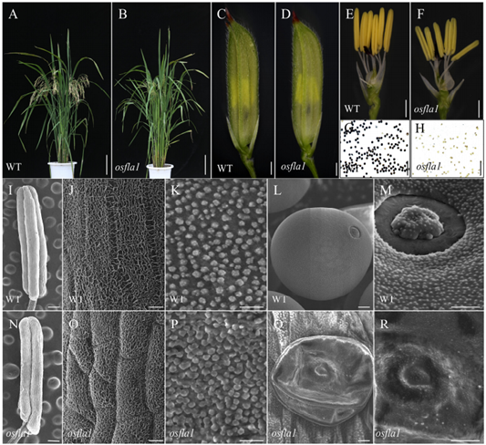 1. 阿拉伯半乳聚糖蛋白(AGPs)是一种富含羟脯氨酸的糖蛋白,存在于所有植物组织和细胞中,在植物生长发育中起着重要作用。目前关于类成束阿拉伯半乳聚糖蛋白(FLAs)参与水稻有性生殖的研究很少。在题为“OsFLA1encodes a fasciclin-like arabinogalactan protein and affects pollen exine development in rice”的研究论文中,该团队分离鉴定出一个水稻隐性雄性核不育突变体osfla1。在osfla1突变体中,花药的乌氏体发育异常,且花粉的外壁内层表现出不连续断裂,由此导致花粉败育。
