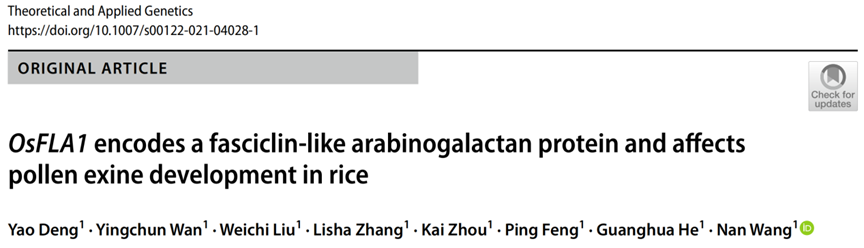 近日,西南大学何光华/王楠团队在THEORETICAL AND APPLIED GENETICS(IF=5.699,一区TOP)上连续发表了题为“OsFLA1encodes a fasciclin-like arabinogalactan protein and affects pollen exine development in rice”与“OsMYB103is essential for tapetum degradation in rice”的研究论文,报道了有关水稻雄性不育的最新研究成果。