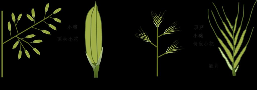 在水稻中,花序有枝梗和小穗两种类型,而小穗的花序本质不为大多数人所知。实际上小穗是禾本科特有的花序结构,由一对苞片和数目不等(1-40)的小花组成,在不同物种中分为确定性小穗和不确定性小穗两类,在确定性小穗物种如水稻、玉米中,小穗分生组织在产生一定数目的侧翼花分生组织后,其顶端分生组织最终会转化为顶花分生组织,从而终止小穗分生组织的命运,这类小穗只能产生固定数目的小花/籽粒。相反,在不确定性小穗物种中,比如小麦、二穗短柄草等,小穗分生组织命运一直维持以产生数目不定的侧翼花分生组织,这类小穗最终产生的小花/籽粒数目是变化的,且一般都大于2个(图1)。理论上,如果能够将水稻确定性小穗定向转化为不确定性小穗,将实现“小穗内小花/籽粒数目”的倍增。