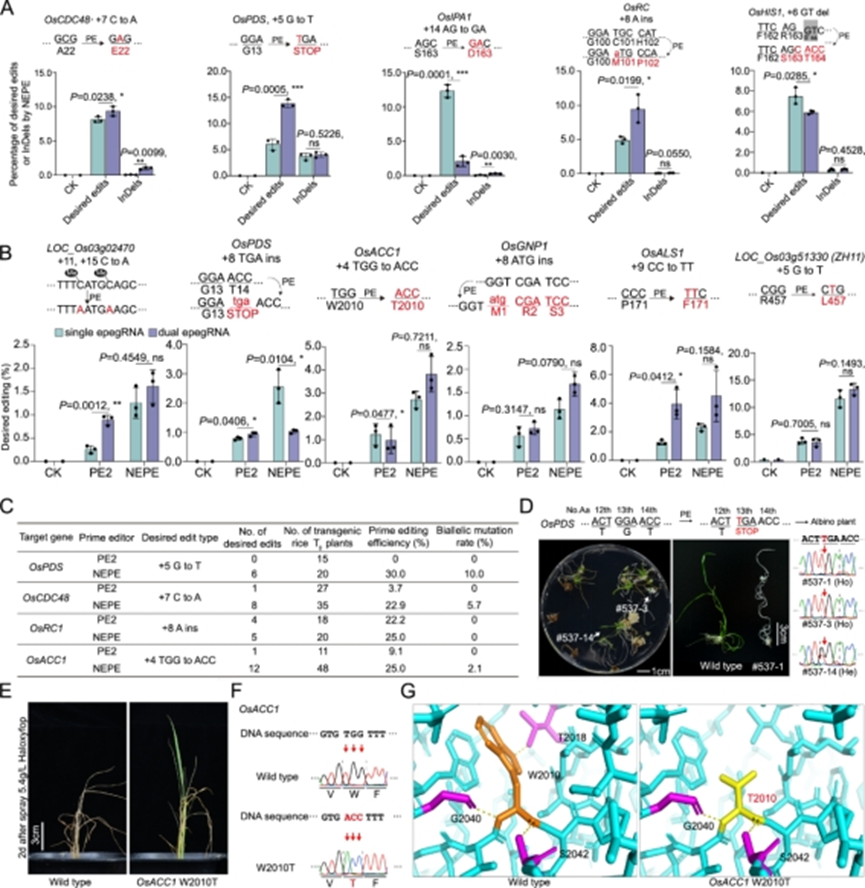 基于NEPE系统进一步测试10个水稻内源位点SNVs创制可行性,经水稻原生质体转化及通量测序分析,明确了NEPE在水稻基因组中实现有效碱基替换、插入及删除编辑的可靠性(图2A-D)。在水稻T0代植株中,NEPE系统显示了22.9%~30.0%的编辑效率,其中双等位编辑效率为2.1%~10.0%(图2C-G),实现了终止密码子精准引入的基因敲除(图2D)及抗除草剂基因新位点定向进化(图2E-G),