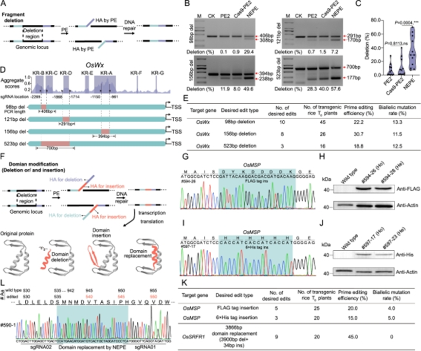 进一步,作者使用NEPE系统对水稻OsWx基因启动子区域进行了位点设计(图4A),在水稻原生质体、T0代植株中实现了98bp~523bp的精准片段删除,NEPE系统的删除效率、精准度较PE2、Cas9-PE2系统更高(图4B-E)。随后,作者应用NEPE系统,在OsMSP基因中实现了FLAG tag、His tag的有效插入,编辑效率为15.0%~20.0%,双等位编辑效率为4.0%~5.0%,并经western blotting明确了插入事件的可靠发生(图4F-J)。最后,作者结合精准删除及插入,针对蛋白质内源区域实现了结构域替换,同时实现了3900bp删除及34bp插入,精准替换效率为45.0%(图4K-L)。