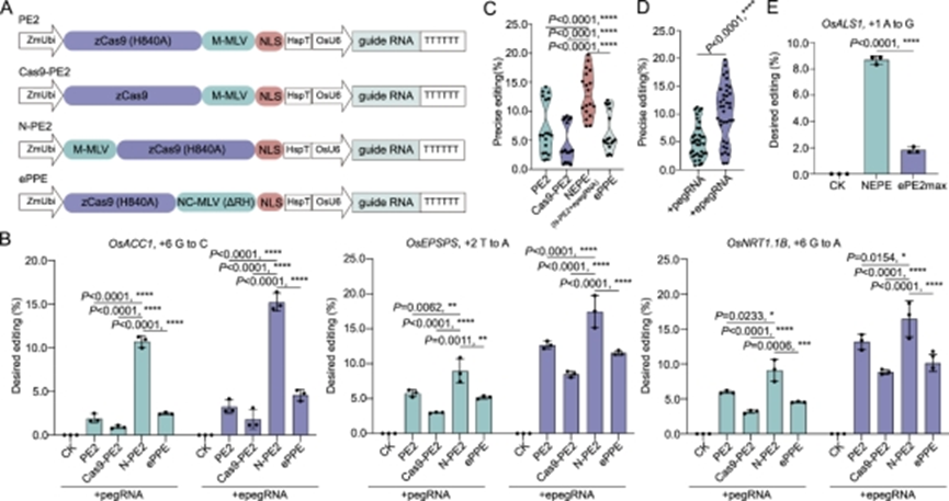 基于蛋白质元件优化,设计构建了4种水稻引导编辑PE2系统(图1A),并在水稻原生质体中对四种PE2系统的编辑效率进行了快速评价。经通量测序分析表明,在所选择已报道的3个位点处,N-PE2系统编辑效率最高,平均编辑效率约为10%(图1B)。而选用epegRNA(pegRNA+ EvopreQ1)可极大地提升编辑效率(图1B-D)。因此,将N-PE2+epegRNA命名为NEPE系统。值得一提的是,在所测试的OsALS1位点处,NEPE系统较此前发表的ePEmax2系统编辑效率更高(图1E)。上述结果表明,引导编辑器融合蛋白结构的简单变化结合epegRNA可以极大地提升水稻中的引导编辑效率。