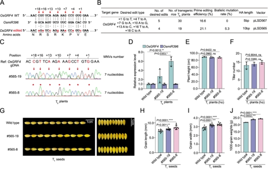 进一步,针对水稻OsGRF4中OsmiR396结合位点进行MNVs创制,在同义替换前提下,对7个核苷酸同时进行编辑(图3A),在水稻T0代植株中,NEPE编辑效率最高为21.1%,双等位编辑效率为5.1%(图3B),有效解除了OsmiR396对OsGRF4的表达量调控,最终通过提升OsGRF4表达量提升农艺性状(图3C-J)。