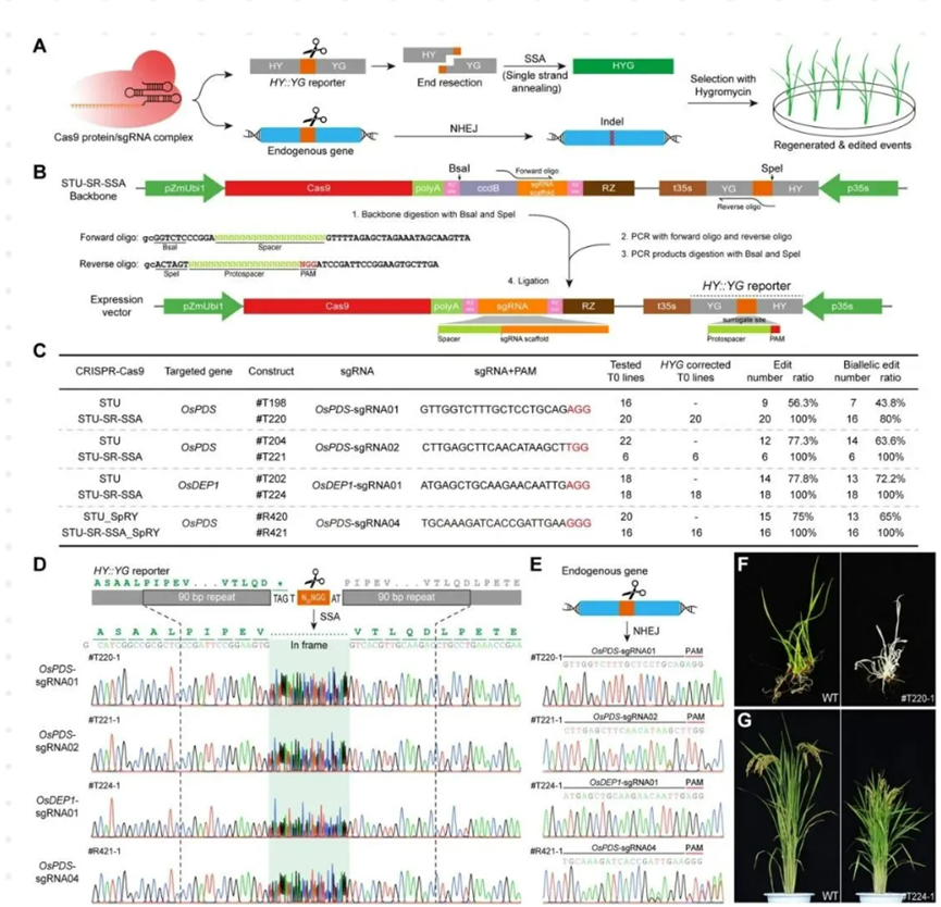 研究者在STU-CRISPR系统基础上,结合包含内源基因编辑位点的筛选标记报告基因,构建了STU-SR-SSA系统。通过使用相同的sgRNA同时针对报告基因和内源基因进行编辑,建立了报告基因编辑与目标基因编辑的直接联系。当报告基因被sgRNA切割后,可通过SSA被修复为有功能的筛选标记基因,从而筛选得到的抗性植株中发生编辑的概率大幅提升。水稻中的实验结果显示,STU-SR-SSA系统在测试的内源基因位点上均达到了100%的编辑效率,与传统系统相比,编辑效率显著提升。此外,双等位基因编辑效率也得到了提高,OsPDS-sgRNA02和OsDEP1-sgRNA01两个位点的双等位编辑效率均达到100%(图1)。