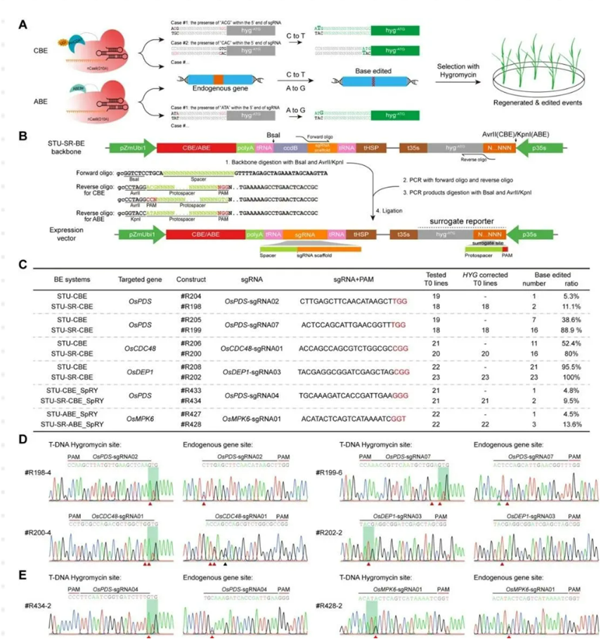 图2 STU-SR-BE基因组编辑系统构建及编辑活性评价