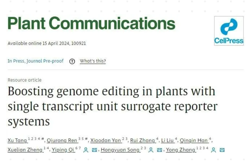 2024年4月13日,学院张勇教授团队联合学校园艺园林学院宋洪元教授团队、马里兰大学Yiping Qi教授在Plant Communications上发表了题为Boosting genome editing in plants with single transcript unit surrogate reporter systems的研究论文。该研究工作基于前期构建的单一转录单元CRISPR-Cas(STU-CRISPR)基因组编辑系统(Tang et al., 2016; Tang et al., 2019),构建了基于代理报告系统的STU-SR植物基因组编辑系统,实现了对Cas9敲除编辑、C to T及A to G碱基编辑事件的高效富集,有效拓展了植物基因组编辑工具箱,为精准植物遗传改良提供了强有力的技术支持。