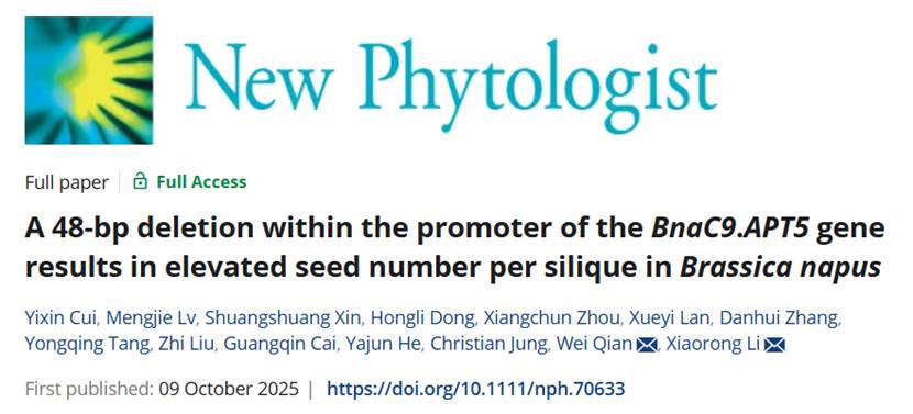 每角果粒数是影响油菜产量的重要农艺性状。油菜每角果粒数是一个典型的数量性状,目前仅少量基因被克隆解析。近日,西南大学工程中心钱伟团队在New Phytologist上发表了题为 “A 48-bp deletion within the promoter of theBnaC9.APT5gene results in elevated seed number per silique inBrassica napus”的研究论文。该研究系统揭示了一个腺嘌呤磷酸核糖转移酶基因BnaC9.APT5,通过促进细胞分裂素合成,进而参与调控油菜每角果粒数的分子机制。该研究不仅为油菜每角果粒数调控分子机理提供了新的见解,也为油菜高产分子育种提供新的靶标。