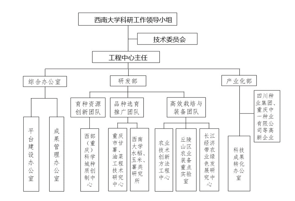 工程中心设立技术委员会,由3名院士和8名国内知名专家组成,负责工程中心建设和运行过程中的技术支持和决策咨询。工程中心实行技术委员会指导下的主任负责制,主任由西南大学科研工作领导小组聘任,新组建的工程中心主任由西南大学实验室建设与设备管理处处长、农业科学研究院副院长卢坤教授担任,另外,聘任两名副主任,由工程技术学院院长谢守勇教授、农学与生物科技学院副院长曲存民教授担任。工程中心成立综合办公室、研发部和产业化部三个主要部门,各部门分工明确,协同运行,打通科研成果从研发到推广应用过程中的各种壁垒,促进完整产业化链条的形成。